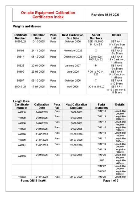 On-site Calibration Equipment Certificates Index